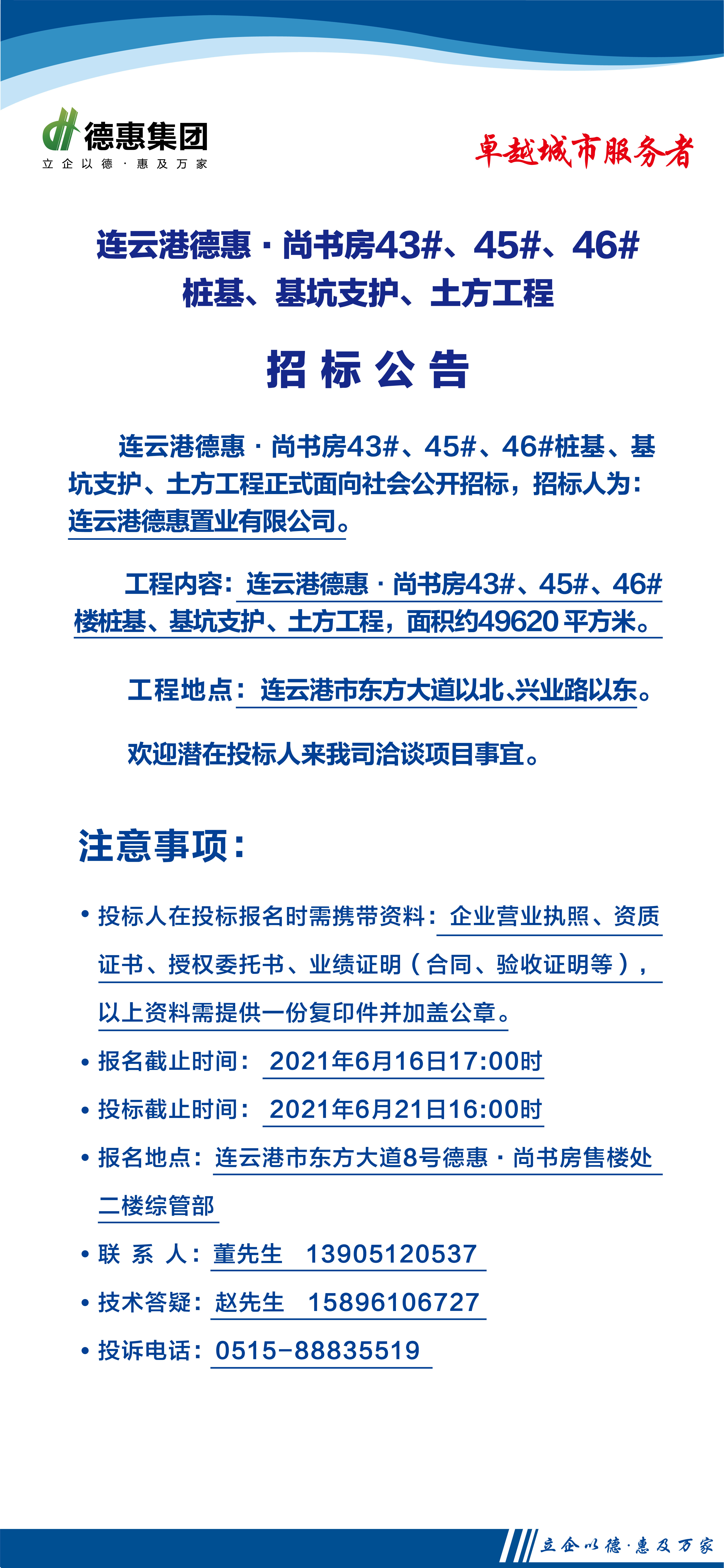 連云港德惠尚書房43#、45#、46#樓樁基、基坑支護(hù)、土方工程招標(biāo)公告