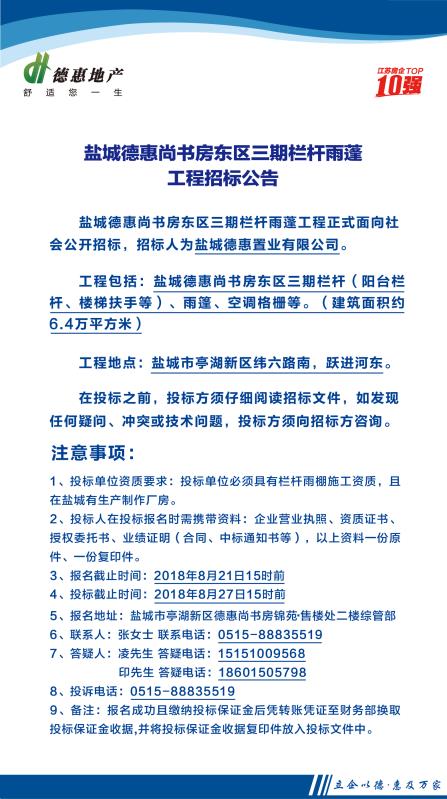 鹽城德惠尚書房東區(qū)三期欄桿雨蓬工程招標公告