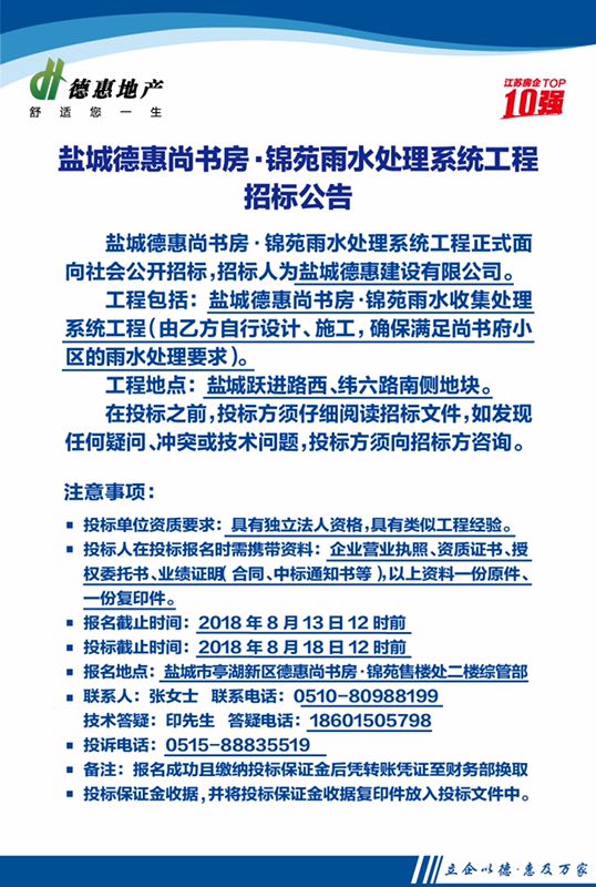 鹽城德惠尚書房•錦苑雨水處理系統(tǒng)工程招標公告