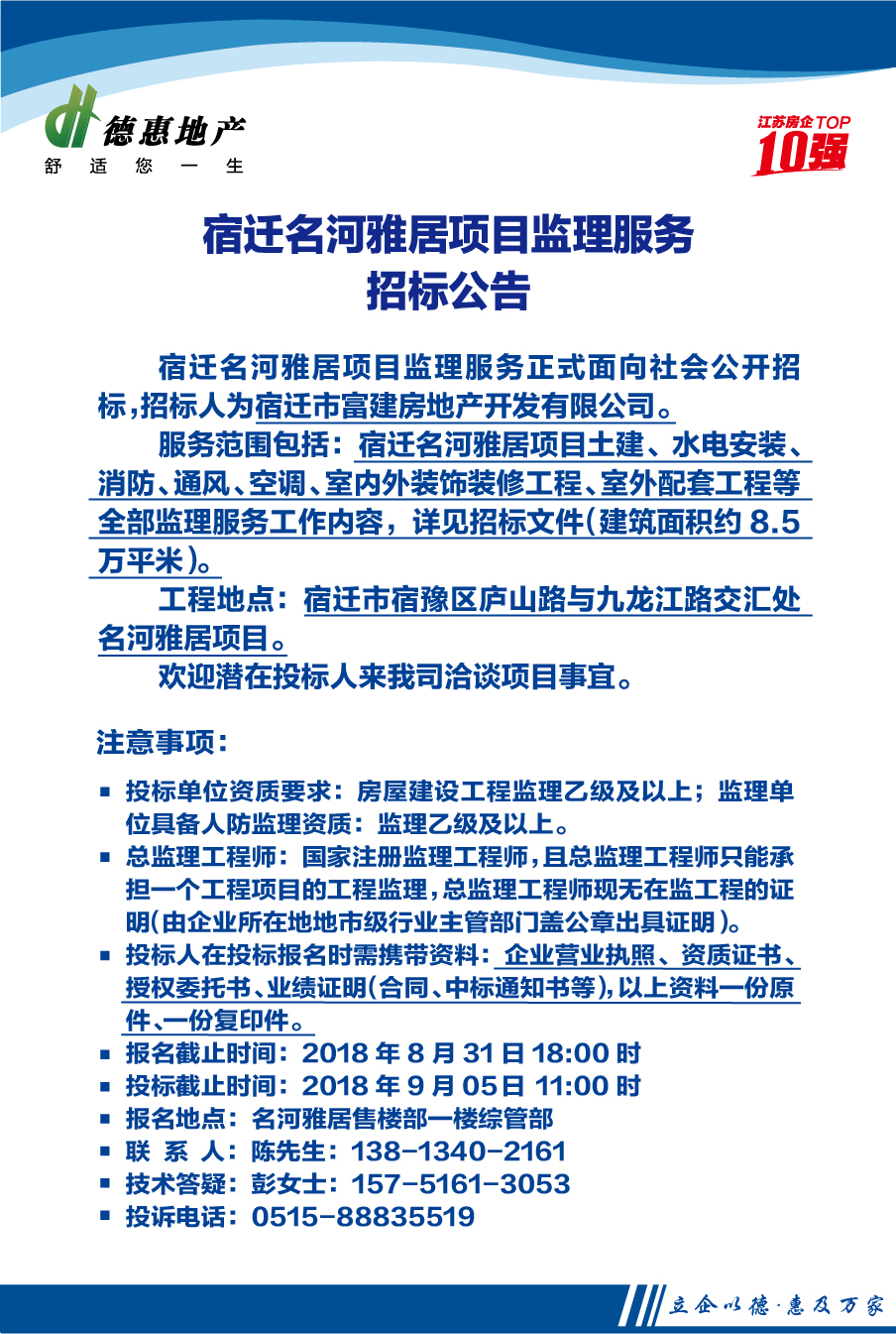 宿遷名河雅居項(xiàng)目監(jiān)理服務(wù)招標(biāo)公告