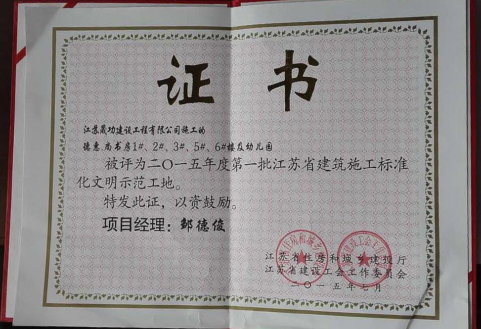 熱烈祝賀鹽城德惠尚書房東區(qū)一期工程被評為“2015年第一批江蘇省建筑施工標(biāo)準(zhǔn)化文明示范工地”!