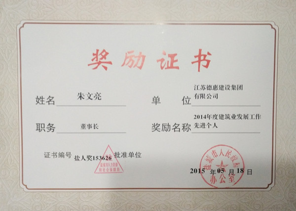 在2014年度鹽城市建筑業(yè)發(fā)展工作考核評選中,我集團(tuán)朱文亮董事長因其在建筑業(yè)的突出業(yè)績,榮獲“2014年度建筑業(yè)發(fā)展工作先進(jìn)個(gè)人”稱號。 市人民政府領(lǐng)導(dǎo)表示,希望全市建筑業(yè)廣大干部職工以先進(jìn)為榜樣,以更加昂揚(yáng)的斗志、更加勤勉的作風(fēng),加快建筑業(yè)轉(zhuǎn)型升級,推動(dòng)建筑產(chǎn)業(yè)現(xiàn)代化,進(jìn)一步推進(jìn)建筑強(qiáng)市建設(shè),為“建設(shè)新鹽城、發(fā)展上臺階”作出新的更大的貢獻(xiàn)。 |