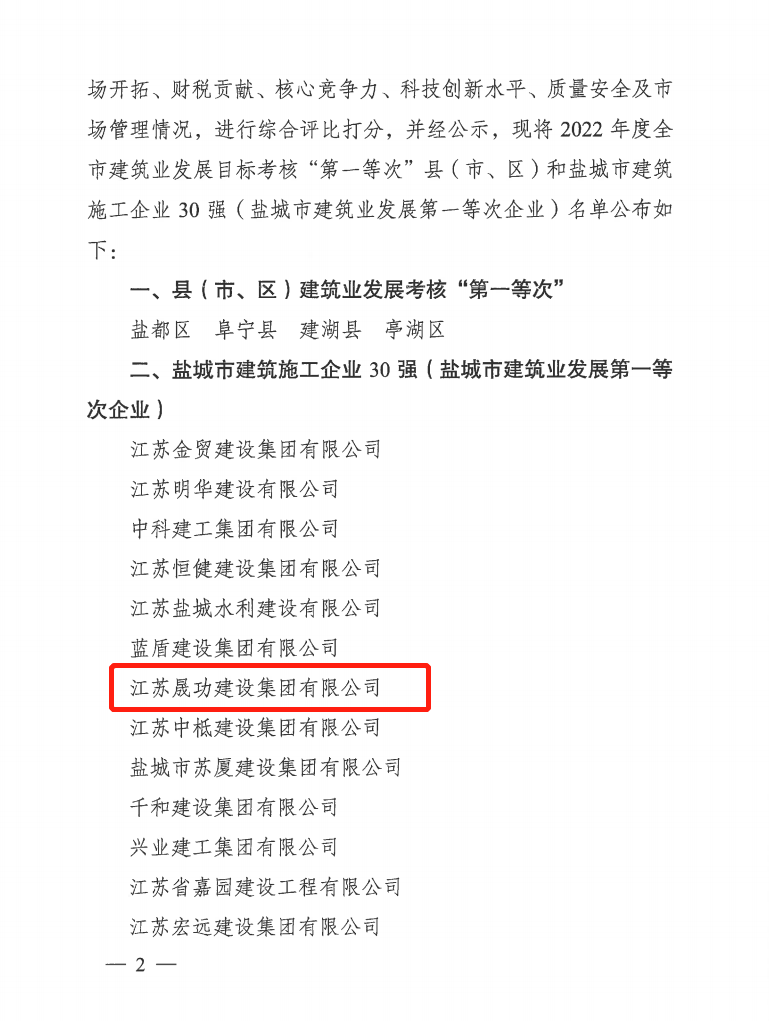 日前,鹽城市人民政府辦公室通報(bào)了《關(guān)于公布2022年度鹽城市建筑業(yè)發(fā)展目標(biāo)考核“第一等次”縣(市、區(qū))和鹽城市建筑施工企業(yè)30強(qiáng)(鹽城市建筑業(yè)發(fā)展第一等次企業(yè))名單的通知》,晟功建設(shè)集團(tuán)榮登鹽城市建筑施工企業(yè)30強(qiáng)榜單,這也是集團(tuán)連續(xù)四年蟬聯(lián)鹽城市建筑業(yè)發(fā)展第一等次榮譽(yù)稱號。