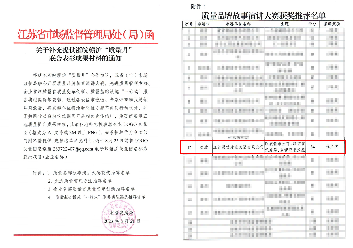 根據(jù)2023年蘇浙皖贛滬“質量月”共同行動安排,蘇浙皖贛滬四省一市市場監(jiān)督管理局決定在全國“質量月”期間聯(lián)合開展先進質量管理方法評選、質量品牌故事演講大賽視頻推薦發(fā)布活動。江蘇晟功集團憑借《以質量求生存,以信譽求發(fā)展,以管理求效益》的品牌故事大賽演講視頻,獲得2023年蘇浙皖贛滬“質量月”質量品牌故事演講大賽優(yōu)勝獎。