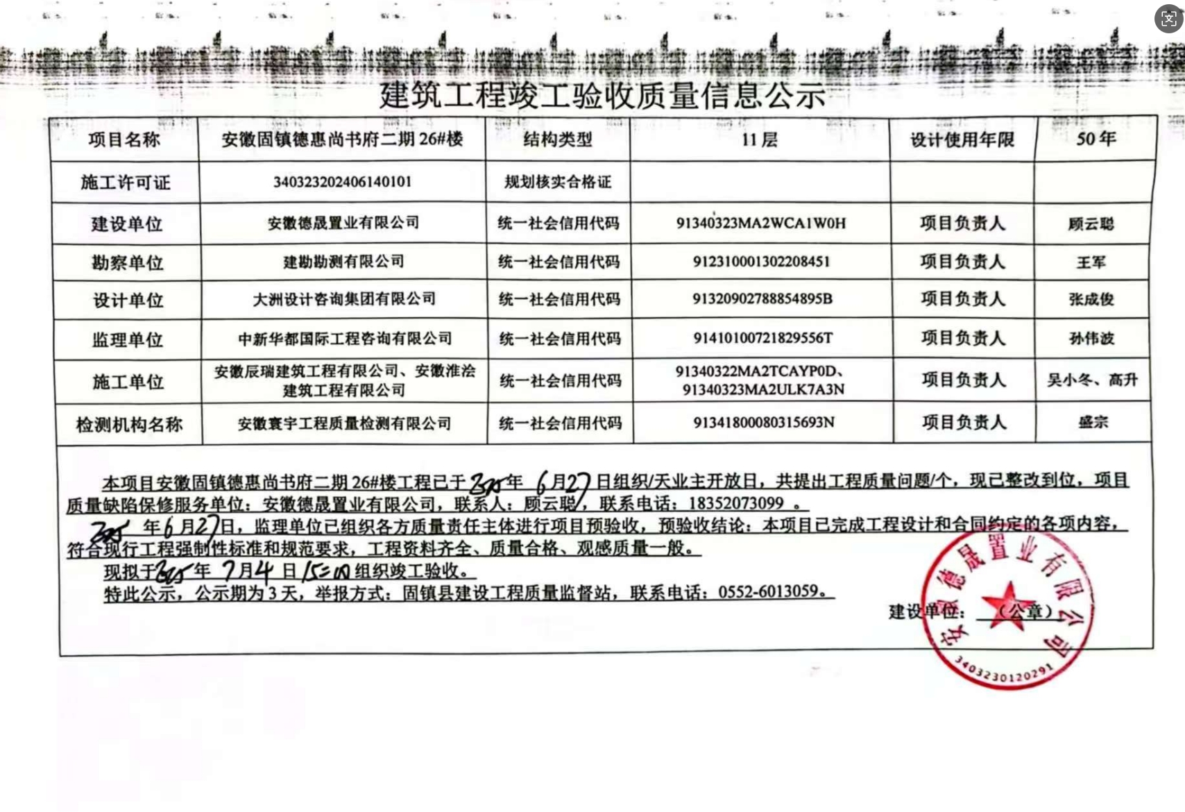 安徽固鎮(zhèn)德惠尚書府二期26#樓建筑工程竣工驗收質(zhì)量信息公示